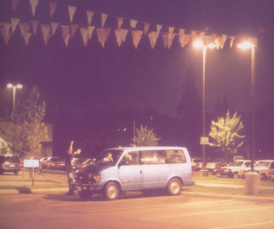 Since Anna spent so much time the washroom doing women things, the guys took the Barney outside and starting playing football with it in the parking lot of the Denny's. By using the Barney as a football and a soccer ball, I am sure we tramatized the kids who were in the Denny's as the parents watched the abuse and carnage of the purple demon. As we where kicking it around, Anna finally came out of the washroom. At about that time, a truck driver walked over from the gas station next door and asked if he could kick it around to since he hated it. Yea, it was fun when he drove by with his 18 wheeler, we put it in front of him, and he ran it over with this truck! Oh the horror of it all! At this time, Michael thought of the great idea of using a zap-strap (nylon plastic ties), to attach it to the front grille of the van so it will catch all the bug splatter of the insects as our van screams down the freeway.