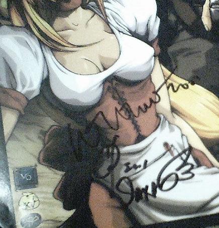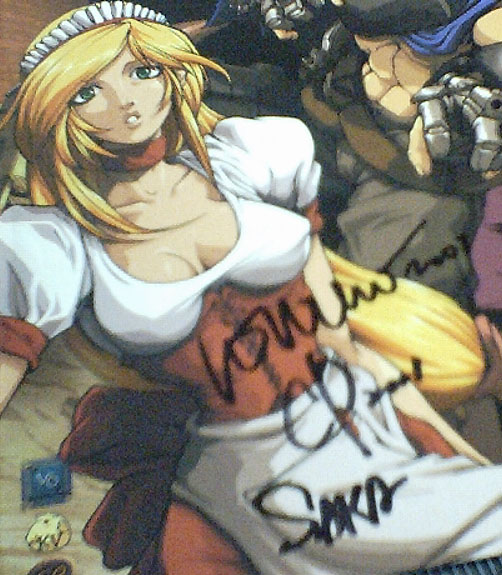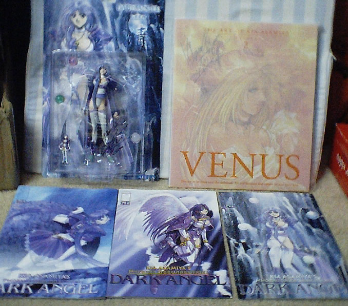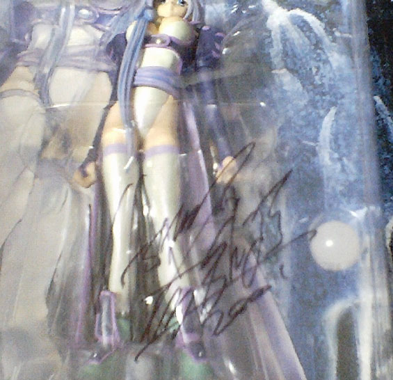 The Toy.com both is the booth for all their various figures. In their display case they had Rurouni Kenshin figures, which I didn't like any of the characters but they look alright. They also had the Berserk figures which look very nice. I was thinking of buying the Caska but the face and the pose looks screwed up on her. I noticed that Kia Ayasima sitting behind the counter but this was like 3:30pm and way passed the 1:00pm that he was suppose to be signing. But I hung around the booth and stirred up converstion. I was talking to the guy about the Dark Angel figures. He wanted to charge me $15 US plus tax. I told him it was only $19.95 Cdn at the Virgin Records Megastore.. Then his buddy goes, if I bought a figure now, he would get Kia Ayasmia to sign it. Ah! Opportunity strikes. I said I would buy one and get him to sign it, if he would do my artbook at the same time. He had to ask through the translator but yup! So I got that taken care of and I didn't have to wait through any lines. Of course, now I have an extra Leem figure but I can always sell that.