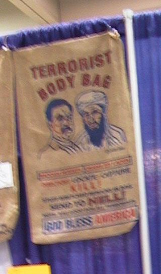 400 Function 410 - lots of cloth scrolls $10 Dumb Eggs - ie. a play on Dumb ASS, but they sell lots of SMUT DVD discontinued Beast City DVD. Wierd item called a terrorist body bag, with God Bless America on it. |