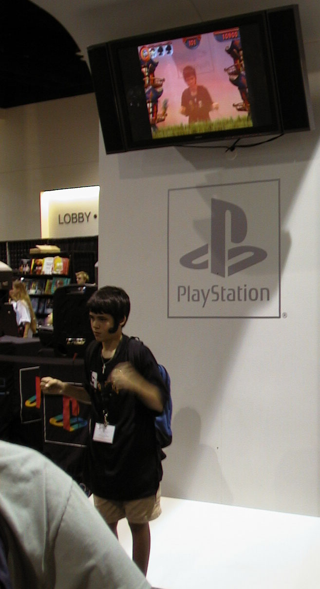 2900 JLA booth Playstation Eye Tag Game display which has a camera to overlays your image into the video game screen using chroma key overlays. Also there was a working demo of Final Fantasy XI Online English. Masters of The The Universe booth Yugioh booth |