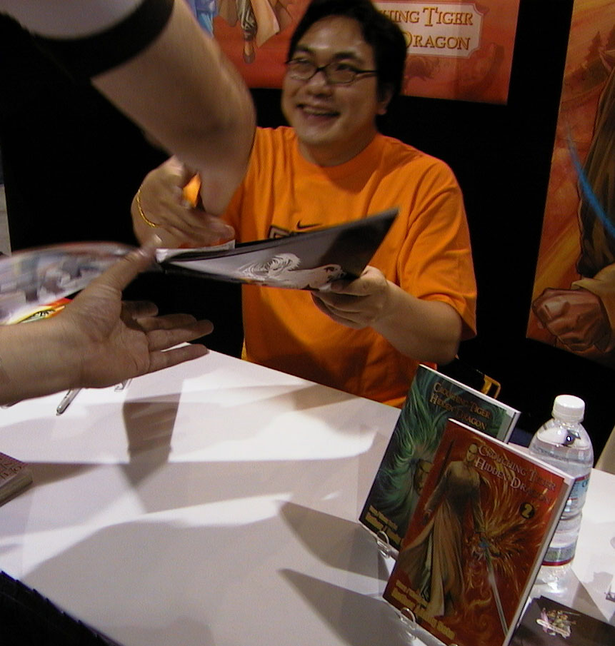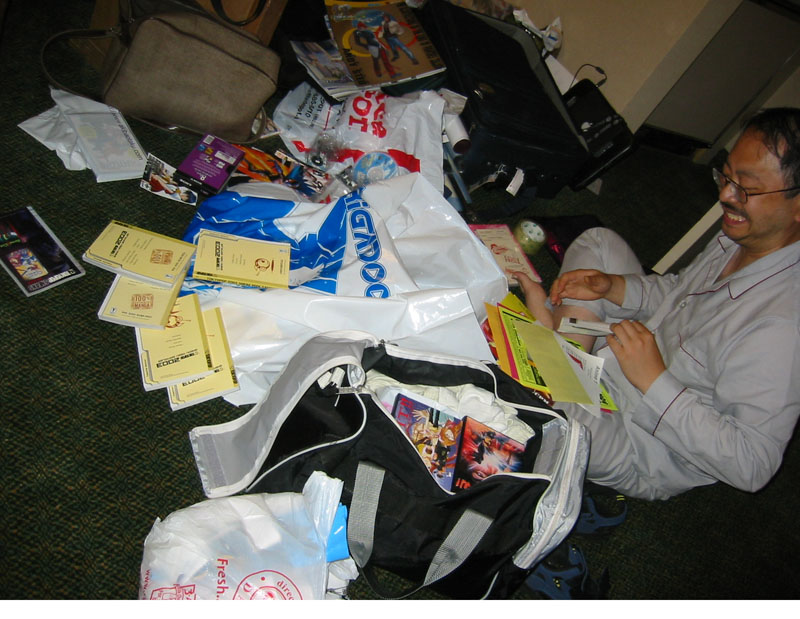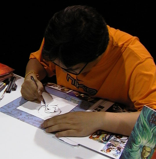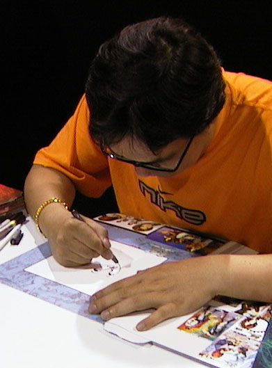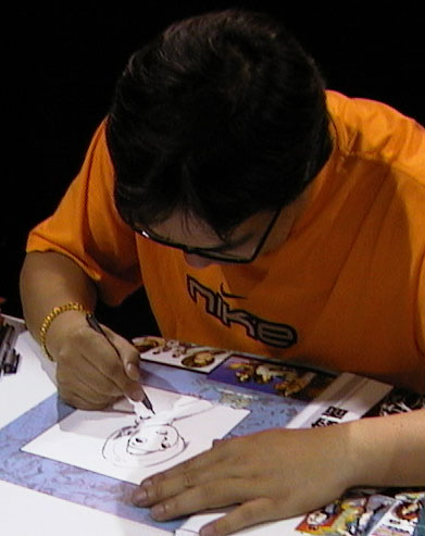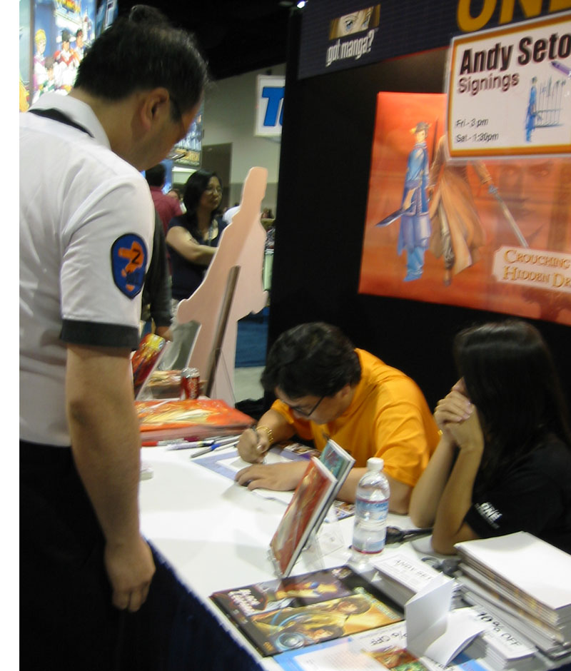 One of the biggest names that I sat in line for was Andy Seto. I was contemplating bringing one of his artbooks down for him to get signed but as it turns out he was here and I bought his new King of Fighters book for him to draw a sketch in. The book is a great KOF book but noticed it has no pictures of Yuri Kankaze in it. So I asked him to draw that. At first, he forgot what Yuri looks like. I had to remind him. I waited almost 2.5 hours for a sketch because he did a sketch for everybody! andy_seto1.jpg , andy_seto2.jpg , andy_seto3.jpg , andy_seto4.jpg, andy_seto5.jpg , Andy_Seto5.jpg |