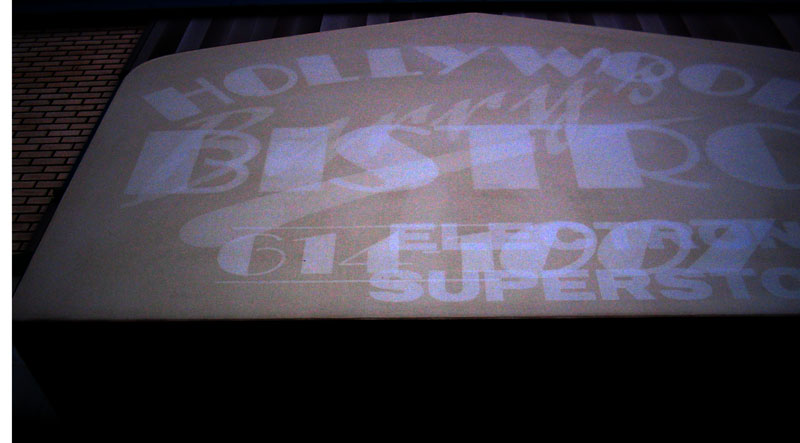 The sign on the door shows just how many times it has changed. This enhanced photo shows it was a Hollywood Bistro, Barry's and of course the Electronics store. Now it is used for an insurance office.