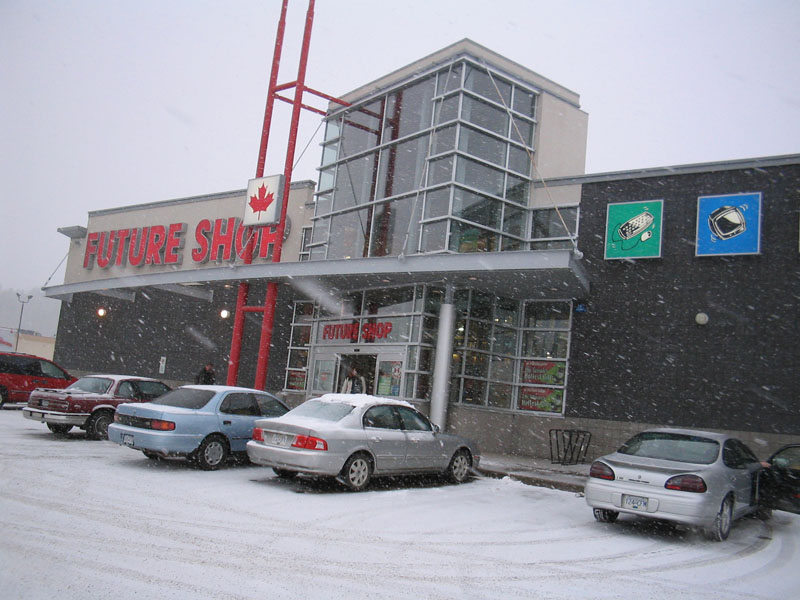 Future Shop. It's the wholely Canadian run, but American "Best Buy" owned Future Shop. Ah yes, hipocracy at it's finest. Don't forget to put the Red, White and Blue Christmas lights around the Canadian Maple Leaf... |