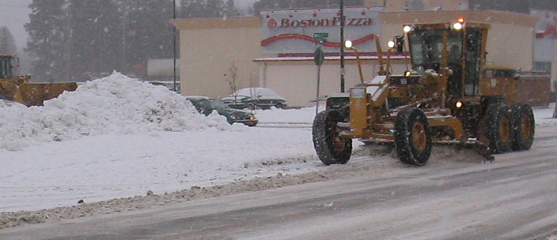There was a crew of 2 graders and a front end loader working on snow removal. First, they use 2 graders to push all the snow to the sides. It is neat to see the sparks fly off the asphalt with the blade.