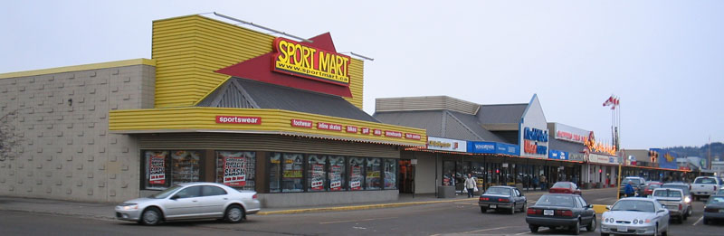 So here is Spruceland Mall, the closest mall to my house. It had the largest Overwaitea in BC. Now it has been renamed to Save On Foods. Stedmans is now Fields. Spruceland News is still there. Safeway is replaced with Mark's Work Warehouse. Shopper's Drug Store is still there. The barber shop is still there. The movie theatres were replaced with a Sportmart over 8 years ago.
