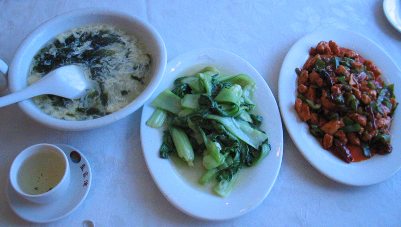 Today's lame lunch. Egg soup, steamed vegetable, and spicy chicken.