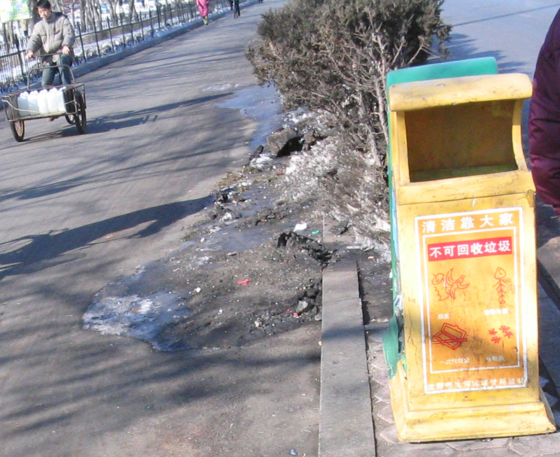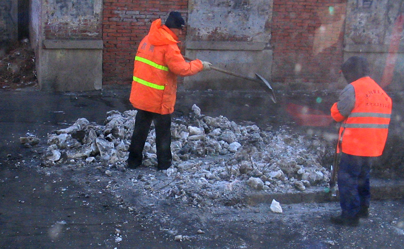 Some city workers doing snow removal. Some days I see them loading snow into their bike carts and moving them. Some days I see them throwing snow into traffic to melt it. I even saw some of them throwing snow down a manhole.
