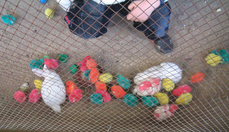 The kids mall on the fourth floor, where they have a caged area off to be used as a petting zoo. In this pen, they have colourful baby chicks and rabbits.