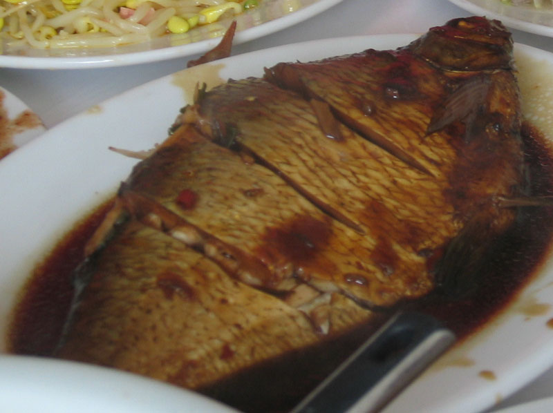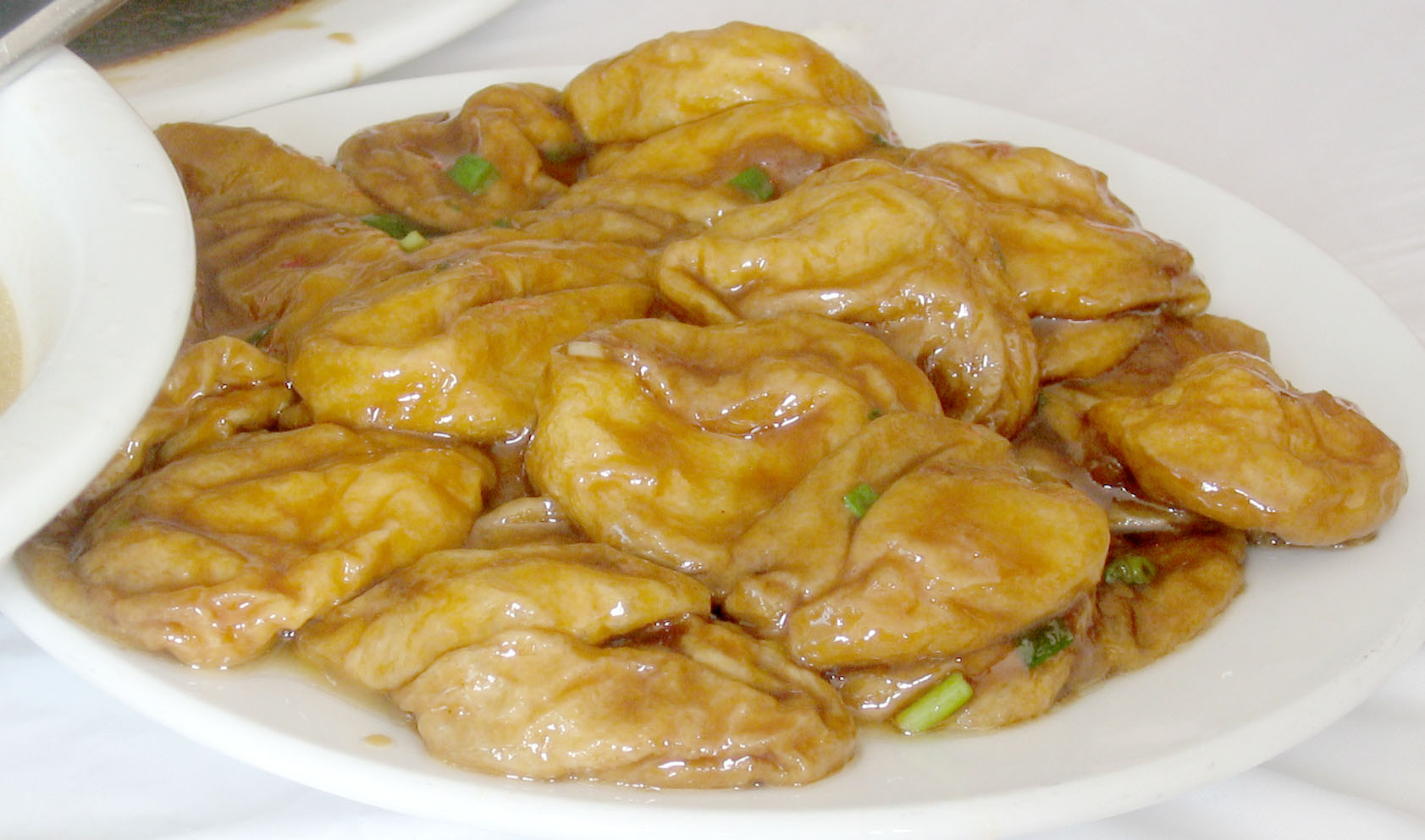 Famous Wuxi City Food called Mianjin, which is gluten (flour with the starch removed). This variation has pork in it. It is a little sticky and slimy and a bit on the tasteless side because all you can taste is pork.