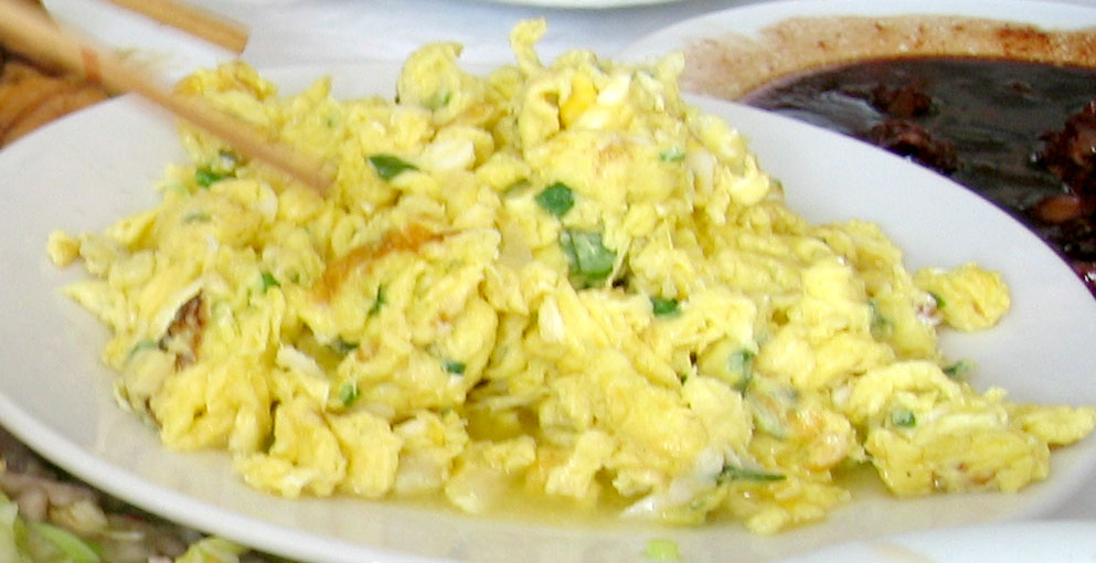 Scrambled eggs and green pepper. Pretty boring. They could have at least added a few chunks of meat or peas and made it egg fu yung, but they're cheap.