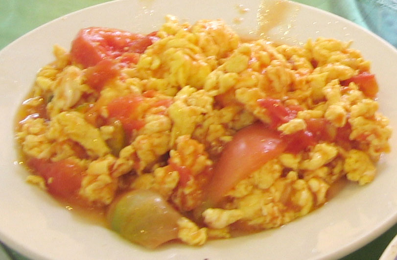 Eggs and tomato. This is lame, the water from the tomatoes make the scrambled eggs soggy. But it is better than the soup version of it.