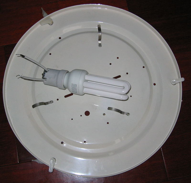 We went to the Obi, where they seemed to be bought out by another company called B&Q. Same building, heck even the same layout, same fixtures, and even some of the same colours. We found their lighting things but couldn't find a replacement for this ballast. I had a feeling I wasn't going to find it. So my back up plan was to get a regular light socket and replace it with a twist on A19 standard compact flourscent. Guess what, they don't even carry raw light sockets. Not for ceilings, covers, or even lamps. This sucks. I did find however, a recessed light kit for 22 yuan that I could cannibalize for the socket and the mount for it. I found a good 20 Watt CF bulb which will give about 100 Watts of light approximately for 18 yuan. It should be fine because the old ballast was using 40W so it should be safe enough for the wires. In retrospect, I could have bought a whole new light for about 79 yuan but it was the old ballast + FS type starter, which was something I wanted to avoid.