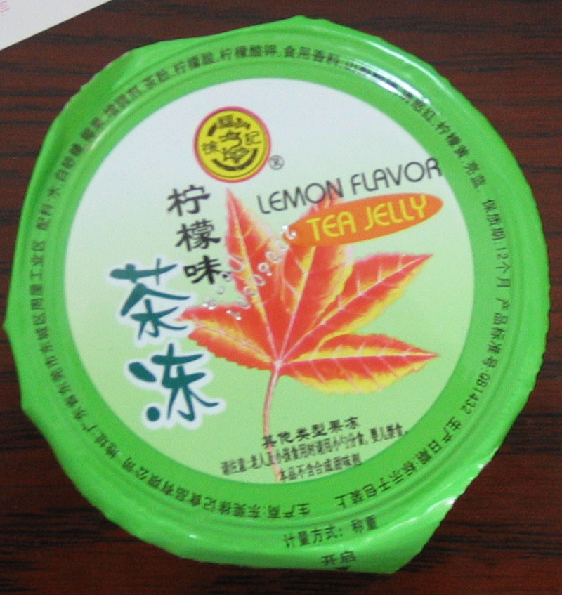 Anyway, the first sip is to pull the layer of fluid off. Very tasty, it is like a very sweet tea. The rest is a Jello like jelly with a few cubes of something suspended in it near the bottom. Yes, the jelly does taste like a weak Chinese tea. It is springy and firm like Jello.