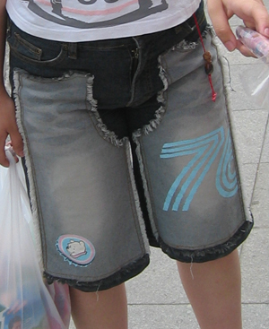 Well, so for Alexanderia, I will look at how many people (men or women) wearing intentionally (or unintentionally) distressed jeans. So I will not count women wearing faded jeans that have designs embroidered on them nor have beads or jewelery like things sewen on. Well, up to point we were paying for the purchases at Fu Market, I counted 16 men and 2 women wearing notably distressed jeans on. Most of the men looked like countryside people who go around with their bikes looking for card board and bottles. There were a couple of men in the Fu market who had more tide and dye and bleach type of jeans. And there were a few men who just were workers who had notable rips in their knees and pockets from tools and wear. These are probably where the jeans that made Alexanderia's 400 yuan pants came from... The two women were very very clean by comparison to the expensive rags my daughter was wearing. Woman one was standing at the cosmetic desk. Her jeans only had a small rip in her back hip pocket roughlly where a logo would have gone. Instead it had been patched back together using a thread weave. The second woman was a janitor in the Fu market, she had a rip in her jeans right at her knee. Most likely work related damage. Conclusion, yes, Alexanderia's 400 yuan pair of fashionable jeans are indeed fashionable, for men, and the lower working class, and country side people. I suppose if you want to portray that image, then what the hey. It is the same reason I wear an anime T-shirt, to let people know that I am an Otaku.